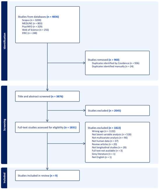 Figure 1 shows the study selection process. Database searches produced 4836 results, which were uploaded into Covidence. A total of 960 duplicates were removed (936 automatically by Covidence and 24 manually). Of the remaining 3876 studies, 2045 were removed during the title and abstract level screening by the first reviewer (M.H.), leaving 1831 full-text studies to be assessed for eligibility. A further 1822 were removed during full-text screening by three reviewers (M.H., G.B., and J.H.). The most common reasons for exclusion were studies that did not include participants in the right age range (1132) and studies that did not involve latent variables analysis (518). The remaining nine studies were included for further data extraction.