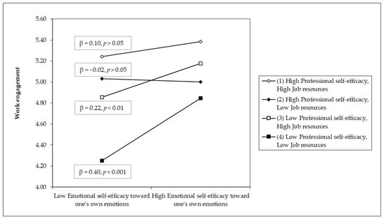 The 3-way interaction between emotional self-efficacy toward one’s own emotions, professional self-efficacy, and job resources on work engagement.