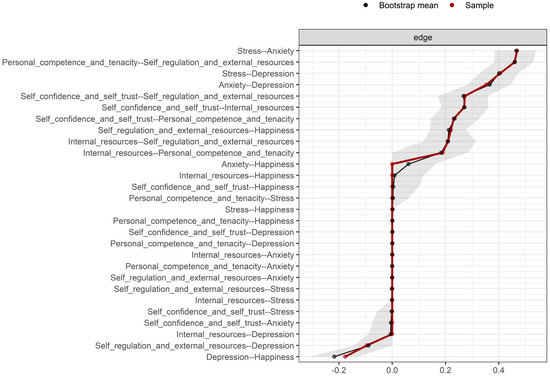 Bootstrapped 95% confidence intervals for all estimated edges in the network. Confidence intervals were obtained through 1000 non-parametric bootstrap resamples. The red dots represent the original sample estimates, whereas the black dots represent the bootstrap means; shaded areas reflect the uncertainty range around each edge.
