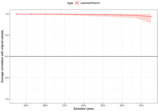 Stability of the expected influence (EI) index assessed using case-dropping subset bootstrapping. The y-axis represents the average correlation between the original expected influence values and those obtained after progressively removing increasing proportions of cases. The shaded area represents the variability of the estimate across bootstrap samples.