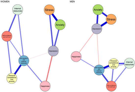 Comparison of network structures by sex (women vs. men). Networks were estimated separately for each group using the same non-regularized GGM procedure. Blue edges indicate positive associations, and red edges indicate negative associations; edge thickness represents the magnitude of the association. The figure illustrates the overall structural similarity between networks prior to formal statistical testing using the Network Comparison Test (NCT).