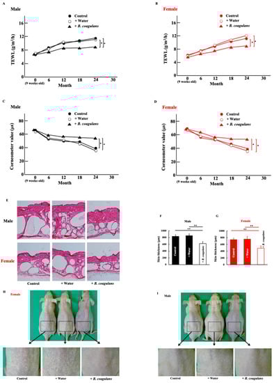 Water retention, an indicator of skin dryness, decreased with age in both male and female mice. Additionally, water transpiration increased with age in both male and female mice. This effect was significantly suppressed by long-term administration of B. coagulans (Figure 1A,B). Conversely, skin hydration (measured in terms of the corneometer value) decreased with age, but B. coagulans administration suppressed the decrease (Figure 1C,D). Skin thickness increased in both males and females, but this was suppressed by B. coagulans administration, with the effect being more pronounced in females than in males (Figure 1E–G). Moreover, after long-term administration of B. coagulans, dorsal skin wrinkles were improved. This effect was also higher in females than in males (Figure 1H–K). Histological examination of the skin of male and female mice showed increased collagen fiber content after long-term B. coagulans administration (Figure 1L,N).