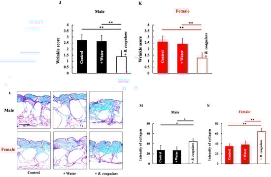 Effect of Bacillus coagulans administration on natural skin aging on the mouse dorsal skin. At the end of the study, we measured transepidermal water loss (TEWL) (A,B), corneometer values (C,D), skin thickness (E–G), wrinkle scores (H–K), and the expression of collagen (L–N) in the dorsal skin of male and female hairless mice. Hematoxylin–eosin staining (E) and Masson trichrome staining (L). Intensity was calculated from five random visual fields with a constant area using the ImageJ software. Black and red columns correspond to male and female mice, respectively. Scale bar = 100 μm. The values are presented as mean ± standard deviation (SD) of five animals. * p < 0.05, ** p < 0.01.