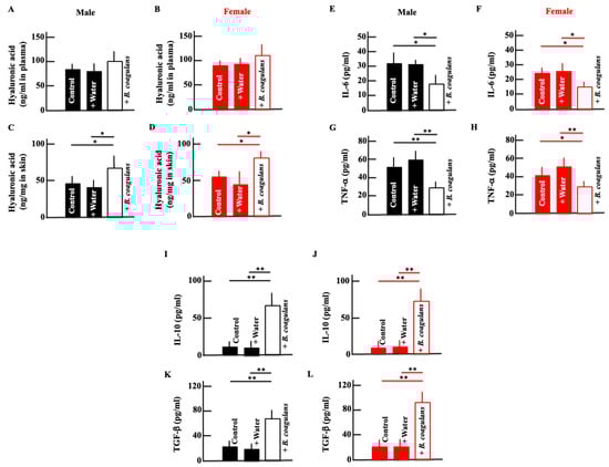 Effect of B. coagulans administration on the plasma levels of hyaluronic acid (A,B), IL-6 (E,F), TNF-α (G,H), IL-10 (I,J), and TGF-β (K,L) and the skin levels of hyaluronic acid (C,D) in male and female mice. Black and red columns correspond to male and female mice, respectively. The values are presented as mean ± SD of five animals. * p < 0.05, ** p < 0.01.