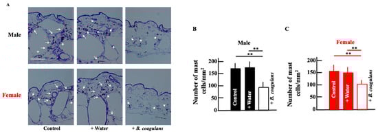 Effect of B. coagulans administration on the expression of mast cells in the dorsal skin of male (A,B) and female (A,C) mice. Skin sections were stained using toluidine blue. Black and red columns correspond to male and female mice, respectively. The values are presented as mean ± SD of five animals. Scale bar = 100 μm. ** p < 0.01.