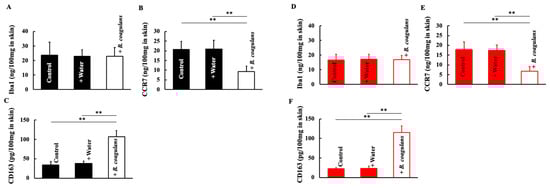 Effect of B. coagulans administration on macrophage differentiation. At the end of the study, we measured the levels of Iba1 (A,D), CCR7 (B,E), and CD163 (C,F) in the dorsal skin of male and female mice. Black and red columns correspond to male and female mice, respectively. The values are presented as mean ± SD of five animals. ** p < 0.01.