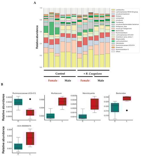 Effect of B. coagulans administration on gut microbiota profile and enterobacterial genera with significant differences detected in relative abundance ratios. Stacked bar graphs show the relative abundance of each bacterial genus in the intestinal flora (A). The 20 genera with the highest average relative abundance of all samples were color-coded, and the other bacterial genera were labeled as “Others”. Mouse numbers are indicated below the stacked bar graphs. We compared the relative abundance ratios of enterobacteria between the control group and the B. coagulans intake group (Wilcoxon rank sum test) (B). In addition, the bacterial family in (B) is included in “Others” in (A). (B) Shows the results for all mice including male and female. C, control group; L, B. coagulans intake group. The values are presented as mean ± SD of three animals. Significant differences were observed between C and L in all parameters (p < 0.05).