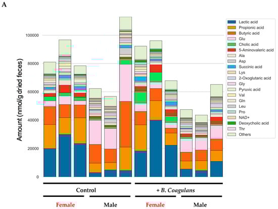 To evaluate the effects of B. coagulans intake on metabolites, comprehensive measurements of fecal metabolites were performed. This assay detected 352 types of metabolites. Of these, 89 qualified as absolute quantifiable metabolites. The number of moles per gram of stool dry weight for these 89 metabolites is shown in stacked bar graphs (Figure 6A). Short-chain fatty acids such as propionic, butyric, and lactic acid were abundant in the feces of female mice. We further compared fecal metabolites comprehensively among the groups and screened for metabolites that were significantly different between the control and the B. coagulans intake group (Figure 6B). As a result, statistically significant differences were detected for 18 metabolites.