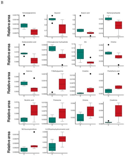 Effect of B. coagulans administration on the fecal metabolite profile and metabolites with significant differences in relative area ratios. Of the fecal metabolites identified in this study, the quantified 89 types of metabolites are shown in stacked bar graphs (A). The 20 metabolites with the highest average amount in all samples were color-coded, and the other metabolites were labeled “Others”. The relative area ratios of the control group and the lactic acid bacteria intake group were compared between the two groups (Wilcoxon’s rank sum test), and the relative area ratios of the metabolites showing significant differences are shown in boxplots (B). (B) shows the results for all mice including male and female. C, control group; L, B. coagulans. The values are presented as mean ± SD of three animals. Significant differences were observed between C and L in all parameters (p < 0.05).