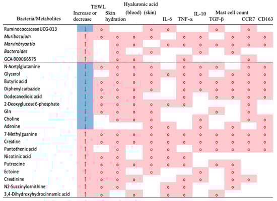Intestinal bacteria and food antigens are present in the intestinal lumen. With an increase in intestinal permeability, these substances flow into the body and induce immune and inflammatory reactions. Furthermore, increased intestinal permeability increases blood levels of metabolites, such as phenol and para-cresol, which eventually reduce skin function [50]. In this study, a significant increase in putrescine levels and a significant decrease in choline levels were observed in the Muribaculum spp. Muribaculum bacteria; putrescine suppresses intestinal permeability and choline enhances intestinal permeability [27,40,43]. Thus, skin symptoms may improve by suppressing intestinal permeability and reducing metabolites that impair skin function.