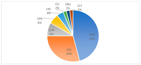 Distribution (%) of clinical patterns after vaccination with either mRNA-1273 or BNT162b2. Abbreviations: maculopapular exanthema (CMP), spongiotic dermatitis (syn. eczema) (CEC), urticarial (CUR), psoriasis-like (CPS), plaque-like (CPL), lichenoid (CLI), bullous (CBU), and pseudolymphomatous (CLY).