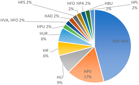Distribution (%) of histological patterns after vaccination with either mRNA-1273 or BNT162b2. Abbreviations: spongiotic (HSP), superficial perivascular predominantly lymphocytic without epidermal changes (HPV), psoriasiform (HPS), lichenoid (HLI), non-lichenoid interface changes (HIF), urticarial (HUR), vasculitis (HVA), panniculitis (HPA), bullous (HBU), acantholytic and dyskeratotic (HAD), pustular (HPU), folliculitis (HFO), and pseudolymphomatous (HPL).