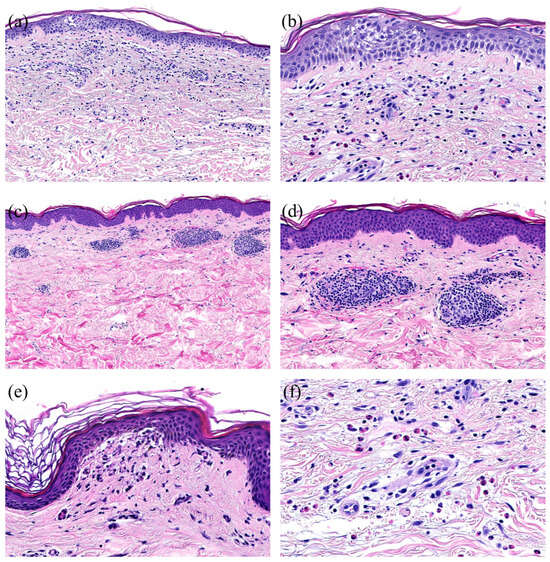 Histopathological patterns of COVID-vaccine-associated cutaneous adverse reactions (ADRs). (a) Spongiotic pattern with focal spongiosis of the epidermis and perivascular predominantly lymphocytic infiltrate (H&E, magnification ×20). (b) Spongiotic pattern (detail) with focal spongiosis of the epidermis and exocytosis of lymphocytes in the spongiotic areas (H&E, magnification ×200). (c) Perivascular pattern with perivascular predominantly lymphocytic infiltrate in the upper dermis in the absence of epidermal changes (H&E, magnification ×20). (d) Perivascular pattern (detail) with sleeve-like perivascular predominantly lymphocytic infiltrate in the upper dermis (H&E, magnification ×200). (e) Interface pattern with vacuolization in the junctional zone (H&E, magnification ×200). (f) High number of eosinophils in the infiltrate (H&E, magnification ×200).