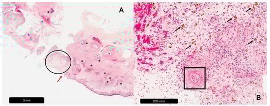 Pyoderma gangrenosum. (A) Overview, black rectangle = massive leukocyte infiltration. (B) Magnification, yellow asterisks = leukocyte infiltration, black rectangles = perivascular lymphocytic infiltrates with associated fibrin thrombi suggestive of secondary vasculitis.