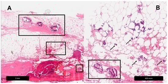 Calciphylaxis. (A) Overview, black rectangles = calcifications in different layers of the skin. (B) Magnification, black rectangle = vessel-associated calcifications, black arrows = extra-arterial calcium deposits.