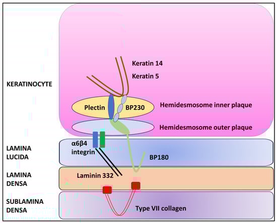 KRT5 is a protein that forms intermediate filaments, or heterodimers, with cytokeratin 14 (KRT14) [,]. Both proteins play a critical role in attaching keratinocytes together and anchoring the epidermis to the dermis (Figure 1) [,,].