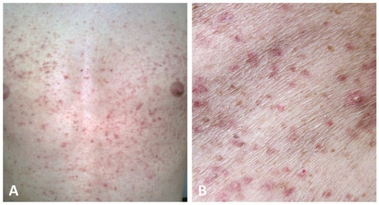 The second presentation, which has been identified in a minority of cases (25/69) and hence defined as atypical, is characterized by erythematous macules and papules widely distributed over the trunk, neck, back, abdomen, and limbs without the involvement of the flexural folds (Figure 4) [,,,,,,,,,,,,].