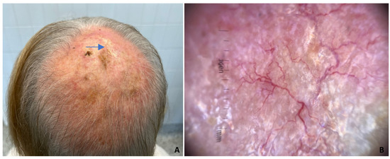 (A) A large, translucent, shiny and waxy alopecic plaque with ill-defined margins and marked neovascularization on the central scalp. The crusted area is due to a previous punch biopsy (arrow). (B) Dermoscopy evidences multiple arborizing vessels, porcelain white areas and complete loss of follicular openings.