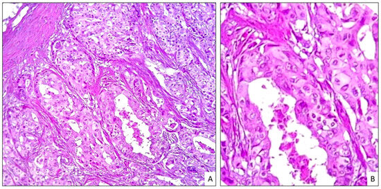 (A) Apocrine breast carcinoma showing large atypical epithelial cells with abundant eosinophilic and granular cytoplasm, enlarged nuclei and prominent nucleoli. (B) High magnification shows pleomorphic discohesive neoplastic cells and cystic necrosis.
