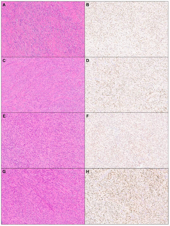 TRPS1 expression in cutaneous mesenchymal neoplasms and tumors of uncertain differentiation. Representative cases of dermatofibroma ((A): H&E ×10, (B): TRPS1 ×10), leiomyoma ((C): H&E ×10, (D): TRPS1 ×10), dermatofibrosarcoma protuberans ((E): H&E ×10, (F): TRPS1 ×10), and leiomyosarcoma ((G): H&E ×10, (H): TRPS1 ×10).
