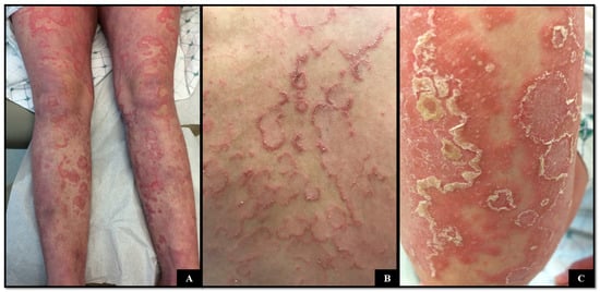 (A–C) Numerous erythematous, serpiginous plaques with a double edge scale on the trunk and extremities.
