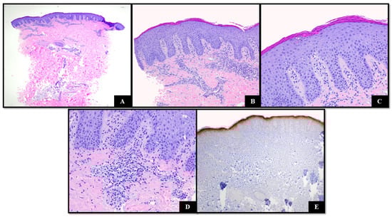 (A) H&E demonstrating regular acanthosis, broad parakeratosis with focal neutrophilic inflammation, mild spongiosis, and superficial perivascular inflammation comprising lymphocytes. (H&E 40×); (B–D) features at higher magnification ((B) H&E 100×, (C,D): H&E 400×); (E) IL-36 staining grade 4 (IL-36 40×).