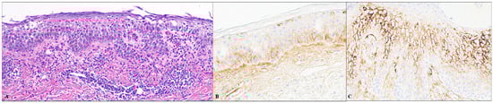 (A) H&E images of a skin biopsies of Grover disease (100×); (B,C) Immunohistochemical staining for IgG4 displaying focal intercellular staining in the lower half ((B)—200×) and upper half of the epidermis ((C)—200×).