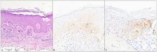 (A) H&E image of a skin biopsy of bullous impetigo (100×); (B,C) Immunohistochemical staining for IgG4 displaying focal intercellular staining in the lower half of the epidermis in one case ((B)—100×) and both upper and lower epidermis in another case ((C)—200×).