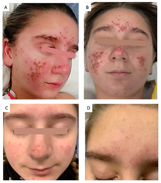 Cutaneous manifestations: (A) Onset of the cutaneous eruption, characterized by erosive lesions on erythematoedematous plaques distributed in the centrofacial area and auricular lobes. (B) Resolution of the erythematoedematous component, persistence of ulcers and crusts. (C) One week after hospital discharge, progressive remission and re-epithelialization of the erosions. (D) One month after hospital discharge, showing residual marks of the rash resembling varioliform scars.
