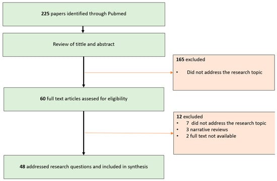 A bibliographic search was conducted in the Medline database through PubMed, using the following search strategy: “Kikuchi-Fujimoto disease” OR “Kikuchi’s disease” OR “Necrotizing histiocytic lymphadenitis” AND (pediatric OR childhood OR children). A total of 225 results were identified. After reviewing titles and abstracts, 60 studies were selected. Three studies were excluded because they were reviews, two studies were excluded due to lack of access, and seven studies were excluded because they were not relevant to the research topic upon full-text review (see Figure 4).