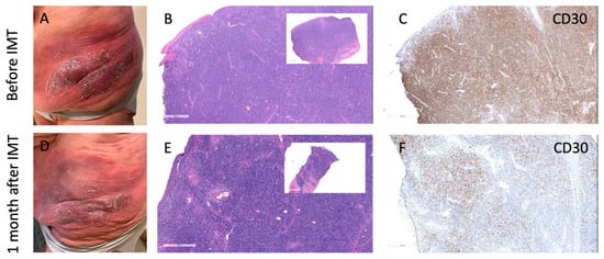 Antigen loss despite persistent infiltrate following brentuximab vedotin treatment in MF. (A–C) Clinical photo (A), H&E (B), and CD30 immunohistochemistry (C) before immunotherapy (IMT) showing dense plaque with strong CD30 expression. (D–F) One month after BV therapy: clinical improvement (D), persistent dense lymphoid infiltrate on H&E (E), but markedly reduced CD30 expression (F), indicating loss of CD30 antigen while lymphoid infiltrate remains. This pattern illustrates the challenge of evaluating residual disease after targeted immunotherapy, as cell presence may persist despite antigen loss.
