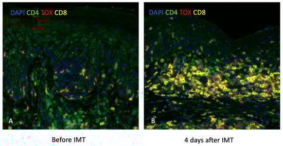 Slides with DAPI, CD4, TOX, and CD8 stains showing increased CD8+ T-cells in the immediate vicinity of malignant cells 4 days after IMT in a patient with MF. (A) Pre-treatment biopsy taken before initiation of IMT shows sparse CD8+ T-cell infiltration in the lesional skin, with scattered CD4+ and TOX+ cells. (B) Biopsy taken 4 days after IMT reveals a marked increase in CD8⁺ T-cell infiltration (yellow), particularly in the tumor-rich dermal areas, indicating early immune activation and potential anti-tumor response.