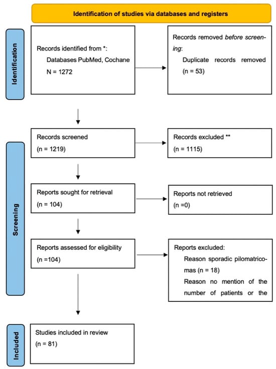 The initial search identified 1272 articles. After removing 53 duplicates and excluding 18 articles reporting only sporadic cases (including familial multiple pilomatricomas without syndrome diagnosis) and 5 articles lacking sufficient patient data, a total of 81 full-text articles were included. Cases of pilomatrical carcinoma were excluded.