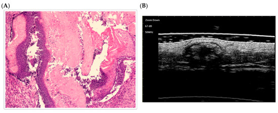 The histological presentation [(A) HE, original magnification ×10] and ultra-high frequency ultrasound (B) of PM in the early stage, indicating no obvious calcification and cystic formation [59].