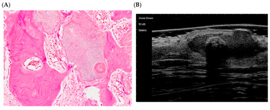 The histological presentation [(A) HE, original magnification ×25] and ultra-high frequency ultrasound (B) of PM in the early regressive stage, indicating arc calcification [59].
