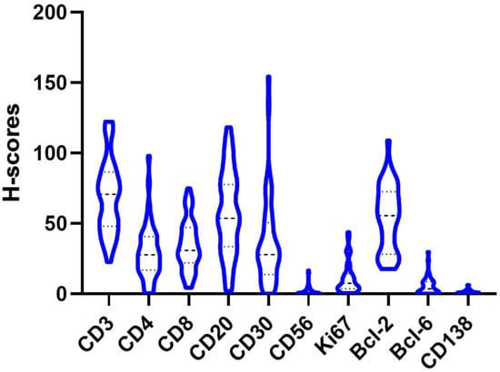 Distribution of the H-score of the different antibodies (Bcl-2, Bcl-6, CD3, CD4, CD8, CD20, CD30, CD56 and CD138) in a violin plot.