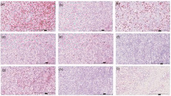Immunohistochemistry of different markers in a HS patient at 200× magnification; (a) CD3; (b) CD4; (c) CD8; (d) CD20; (e) CD30; (f) CD56; (g) Bcl-2; (h) Bcl-6; (i) CD138.