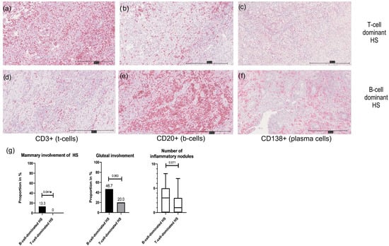 Presentation of a T-cell-dominant HS subtype at 100× magnification (a–c); (a): immunohistochemistry for CD3; (b): immunohistochemistry for CD20; (c): immunohistochemistry for CD138; expression of CD3+ cells > sum of CD20+ and CD138+ cells) compared to a B-cell-dominant HS subtype at 100× magnification (d–f); (d): immunohistochemistry for CD3; (e): immunohistochemistry for CD20; (f): immunohistochemistry for CD138; expression of CD3+ cells < sum of CD20+ and CD138+ cells); (g): clinical characteristics of B-cell- and T-cell-dominant HS are presented as bar graphs or box plots. B-cell-dominant HS is more likely to show mammary and gluteal involvement and more nodules than T-cell-dominant HS; * significant result.