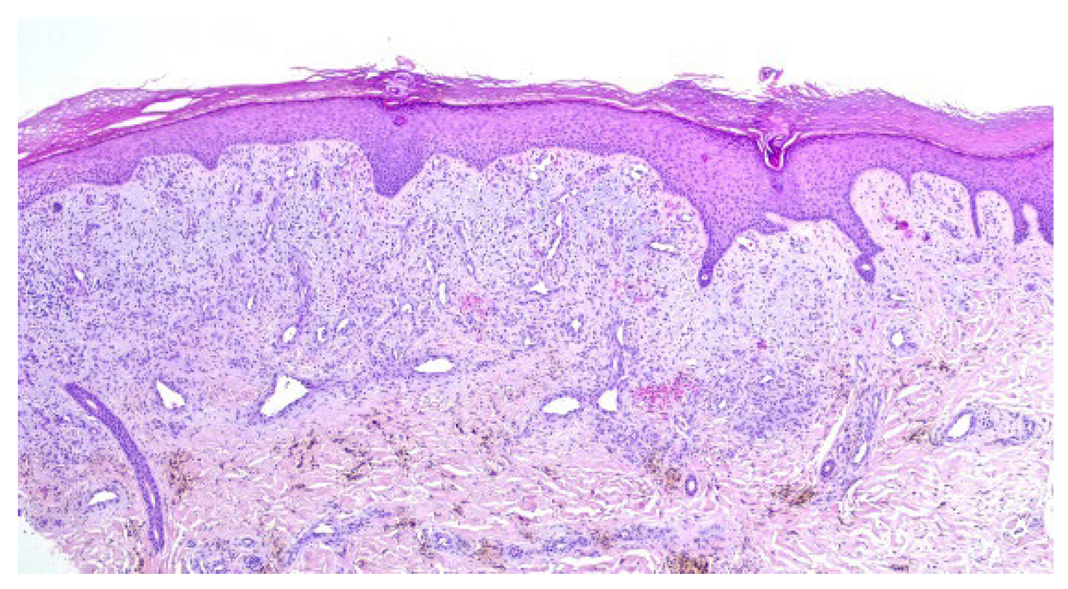 5]. In some cases, plump endothelial cells, an increased number of fibroblasts, dermal fibrosis, papillary dermis oedema, and a superficial mixed inflammatory infiltrate (lymphocytes, histiocytes, and eosinophils) are also observed [