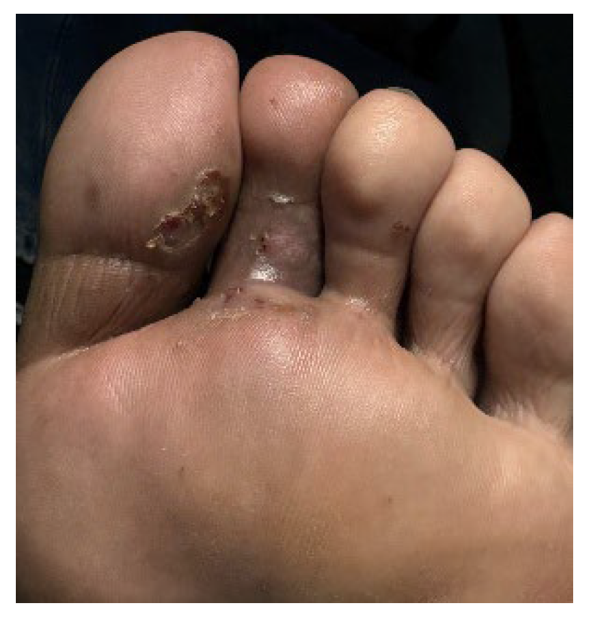 Figure 1). Additionally, it extended towards the plantar surface of the distal and proximal/middle phalanges of the first and second toes, respectively (