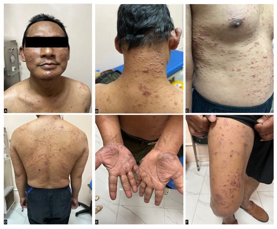 Clinical presentation of a 47-year-old male with multiple cutaneous neurofibromas. (A) Frontal view of the face showing multiple small, pinkish to violaceous papules and nodules. (B) Posterior view of the neck displaying clusters of dome-shaped papules with no signs of ulceration or inflammation. (C) Anterior view of the chest and abdomen revealing numerous scattered papules with a visible café-au-lait macule measuring approximately 3 × 2 cm located below the right breast. (D) Posterior view of the back showing widespread distribution of nodular lesions with varying sizes. (E) Palmar view of both hands revealing the presence of multiple hyperpigmented macules consistent with palmar freckling. (F) Anterolateral view thigh, highlighting similar lesions extending to the lower extremities.