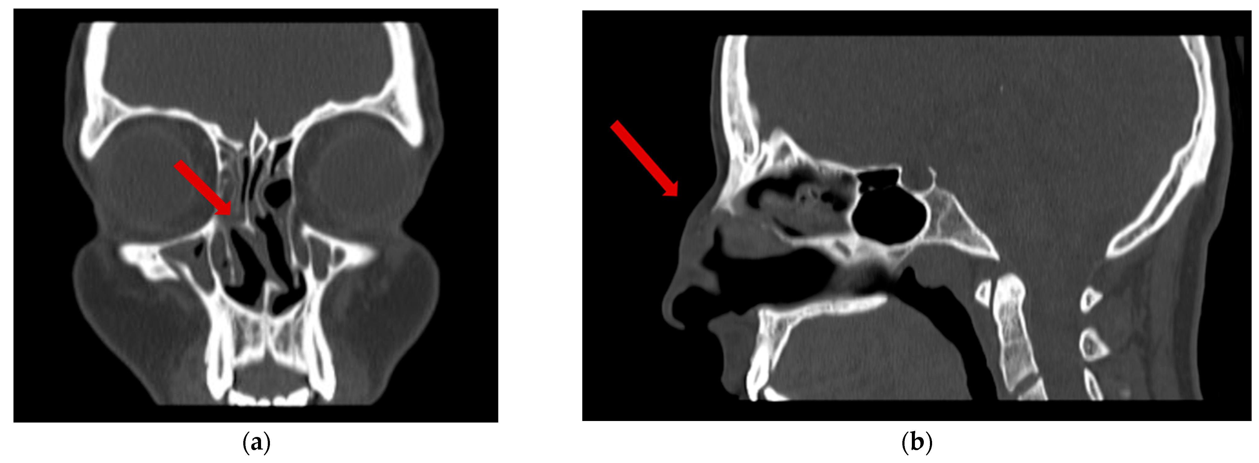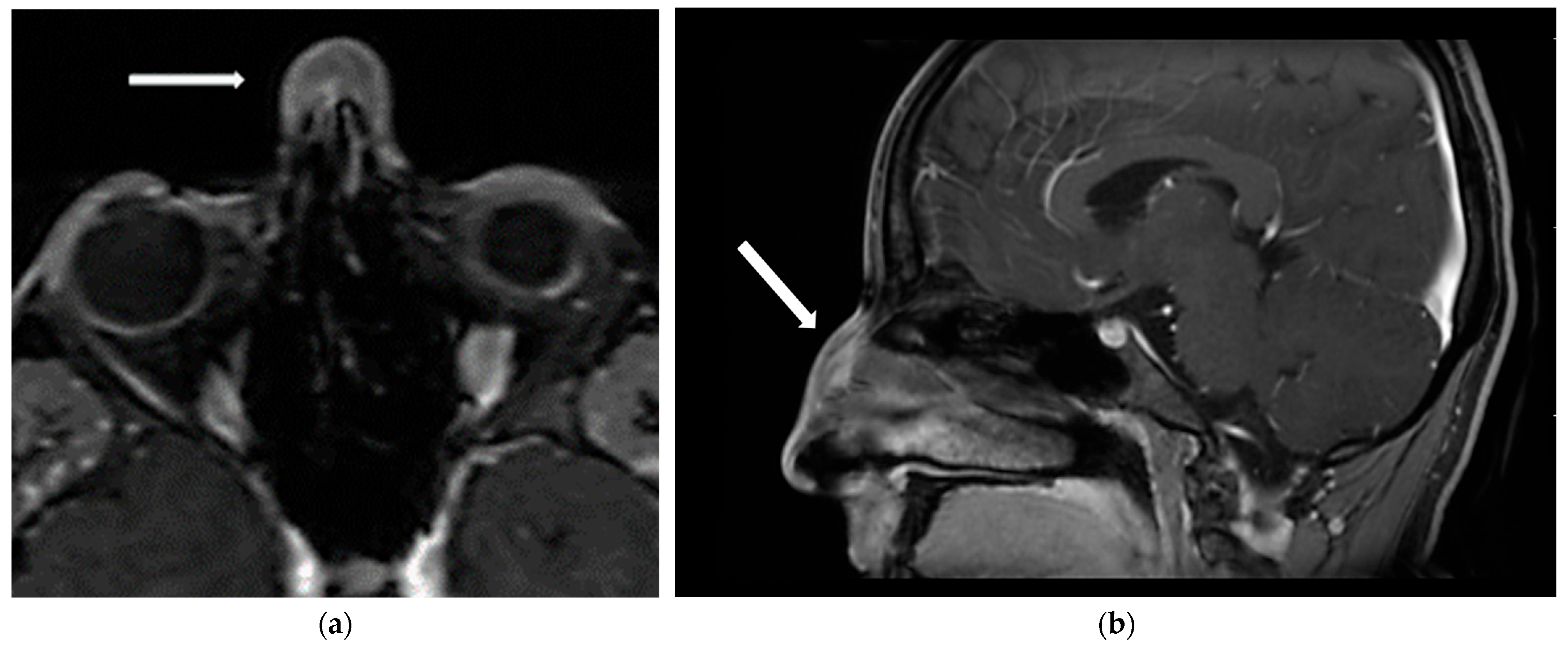 - Kotowski, M. The differential diagnosis of congenital developmental midline nasal masses: Histopathological, clinical, and radiological aspects. Diagnostics 2023, 13, 2796. [Google Scholar] [CrossRef]