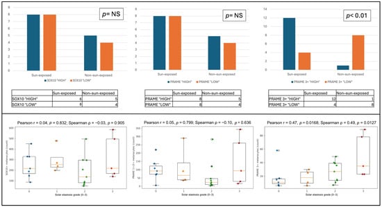 Distribution of melanocytic density, PRAME expression, and correlation with photo exposition and solar elastosis. Upper panels: distribution of cases according to lesion site (sun-exposed versus non-sun-exposed skin). Left panel: cases classified as SOX10 “HIGH” or “LOW” according to total melanocytic density assessed by SOX10 immunohistochemistry, showing no significant association with lesion site. Middle panel: cases classified as PRAME “HIGH” or “LOW” according to the PRAME/SOX10 ratio, reflecting the proportion of PRAME-positive melanocytes irrespective of staining intensity, also showing no significant association with lesion site. Right panel: cases classified as PRAME 3+ “HIGH” or “LOW” according to the PRAME 3+/SOX10 ratio, reflecting the proportion of melanocytes with strong nuclear PRAME expression; a significant enrichment of PRAME 3+ “HIGH” cases was observed in lesions arising on sun-exposed skin (p < 0.01). Lower panels: box plots showing the relationship between solar elastosis grade (0–3) and the absolute number, across all cases, of SOX10-positive melanocytes (left), low-intensity PRAME-positive melanocytes (1+/2+) (middle), and high-intensity PRAME-positive melanocytes (3+) (right). No significant correlation was observed for SOX10-positive melanocytes or low-intensity PRAME-positive melanocytes, whereas high-intensity PRAME expression showed a moderate positive correlation with increasing solar elastosis.