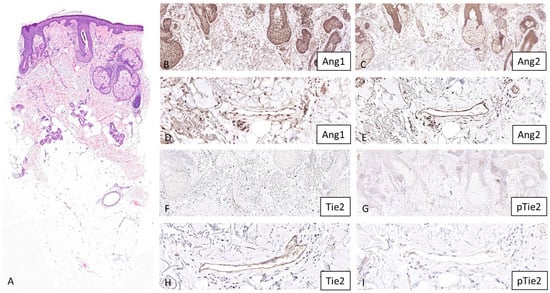 Angiopoietin 1 (Ang1), Angiopoietin 2 (Ang2), Tie2, and pTie2 stainings in rosacea skin. Skin biopsy of a rosacea patient with papulopustular lesions shows subcorneal/intraepidermal collections of neutrophils realizing pustules, ectatic dermal vessels, and perivascular and perifollicular inflammatory infiltrate of lymphocytes and histiocytes ((A), hematoxylin eosin staining, original magnification, 2×). Dermal vessels show an increased immunostaining for Angiopoietin 2 ((C), original magnification, 6.5× and (E), original magnification, 26×) and Tie2 ((F), original magnification, 6.5× and (H), original magnification, 26×), when compared with the immunostainings for Angiopoietin 1 ((B), original magnification, 6.5× and (D), original magnification, 26×) and pTie2 ((G), original magnification, 6.5× and (I), original magnification, 26×). The evaluation of immunostaining was performed in a blinded fashion using a scoring system of 0–3 according to the intensity of staining (0: no staining, 1+: slight staining, 2+: moderate staining, 3+: strong staining) after the examination of 3 microscopic fields per subject by a board-certified dermatopathologist (GK).