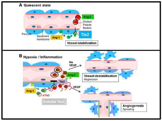 The loss of vascular quiescence WHO and HOW. Vascular quiescence: Ang1, produced by pericytes (green circles), binds its receptor Tie2 on endothelial cell membranes. This permanent activation allows vessel stabilization or quiescence (A). Loss of quiescence occurs when Ang2, produced by endothelial cells and stored in Weibel–Palade bodies (red circles), is released out in hypoxia or inflammation. Ang2 blocks access of Ang1 to Tie2. Inhibition of Tie2 signaling by Ang2 induces vessel destabilization. Loss of quiescence results in either apoptosis and regression of the vessel if no VEGF is available, or in neo-angiogenesis if VEGF is available. Soluble Tie2 acts as a complex modulator: Tie2 released from endothelial cell membranes binds to both Ang1 and Ang2, thus inhibiting their binding to cellular Tie receptors (B) [8].