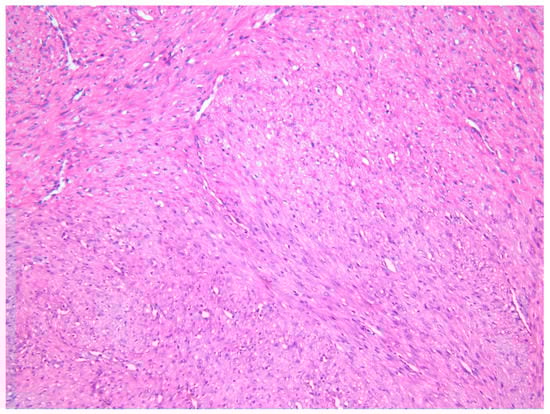 Photomicrograph exhibiting low-grade myofibroblastic sarcoma (LGMS) composed of spindle-shaped cells arranged into fascicles—Case 1 (hematoxylin and eosin stain ×10).
