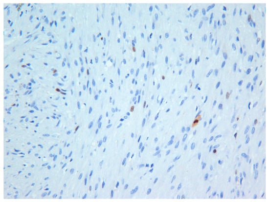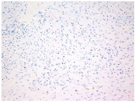 Photomicrograph exhibiting low Ki-67 (MIB-1) activity in the tumor—Case 3 (×20).