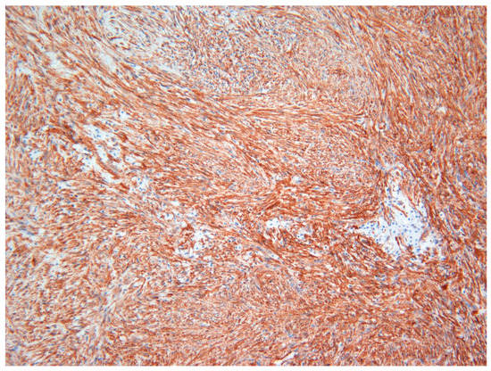 Immunohistochemical investigations with smooth muscle actin (SMA) revealed strong positivity in tumor cells in Case 1 (×20).