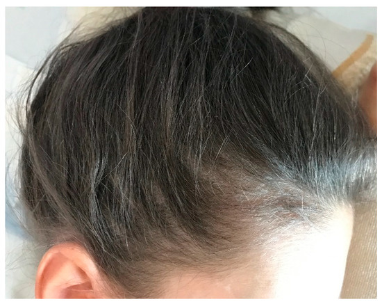 A 10-year-old Spanish girl presented to our dermatologic clinic with discoloration of the scalp and eyebrow since birth. She was born out of consanguineous marriage and had a twin sister with similar phenotype. A 13-year-old brother was healthy. The patient’s clinical history revealed that she also suffered from developmental delay and epilepsy with tonic-clonic seizures. Moreover, she had severe neuromuscular scoliosis, with perpendicular obliquity of sapropelic origin. She also suffered from gastro-oesophageal reflux and was being studied by an endocrinologist for early puberty.