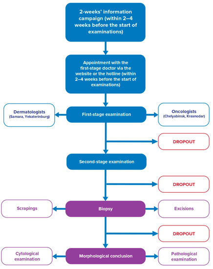 Skin examinations were performed in a two-stage mode. In Samara and Yekaterinburg, dermatologists/venereologists completed the first-stage skin examination by a dermatoscope. In Chelyabinsk and Krasnodar, oncologists performed the first-stage skin examination with or without dermatoscopes. In case of a suspicious lesion, the participant went for the second-stage examination visiting an oncologist/oncodermatologist.